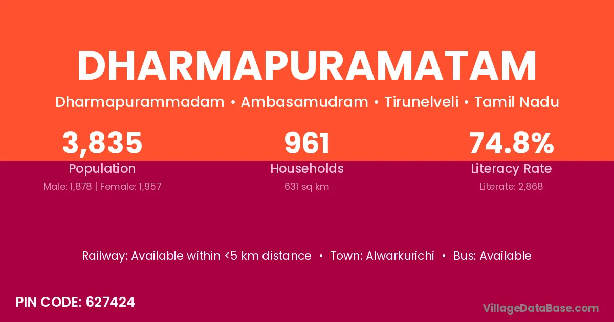 Dharmapuramatam village has a total population of 3,835 people, of which 1,878 are males and 1,957 are females.