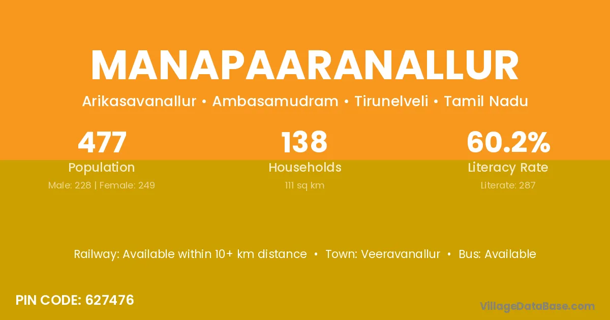 Manapaaranallur village has a total population of 477 people, of which 228 are males and 249 are females.