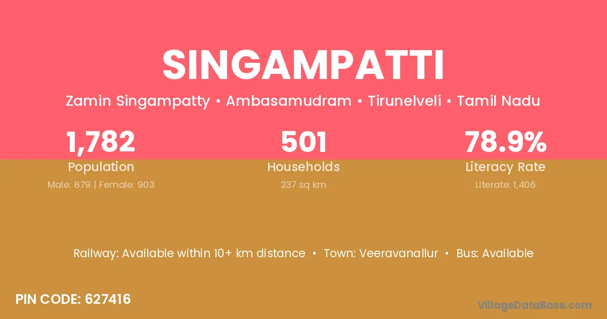Singampatti village has a total population of 1,782 people, of which 879 are males and 903 are females.