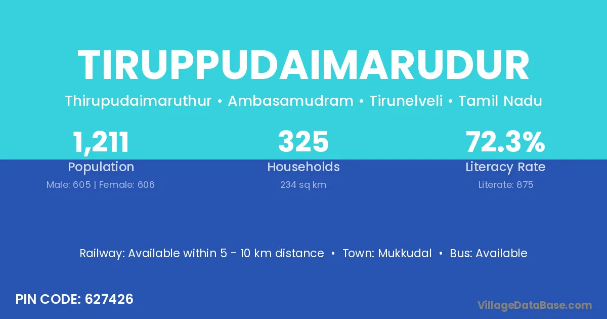 Tiruppudaimarudur village has a total population of 1,211 people, of which 605 are males and 606 are females.