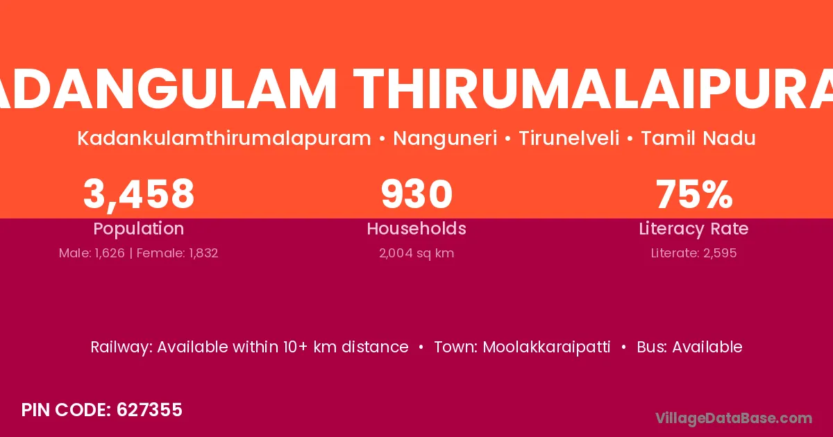 Kadangulam Thirumalaipuram village has a total population of 3,458 people, of which 1,626 are males and 1,832 are females.