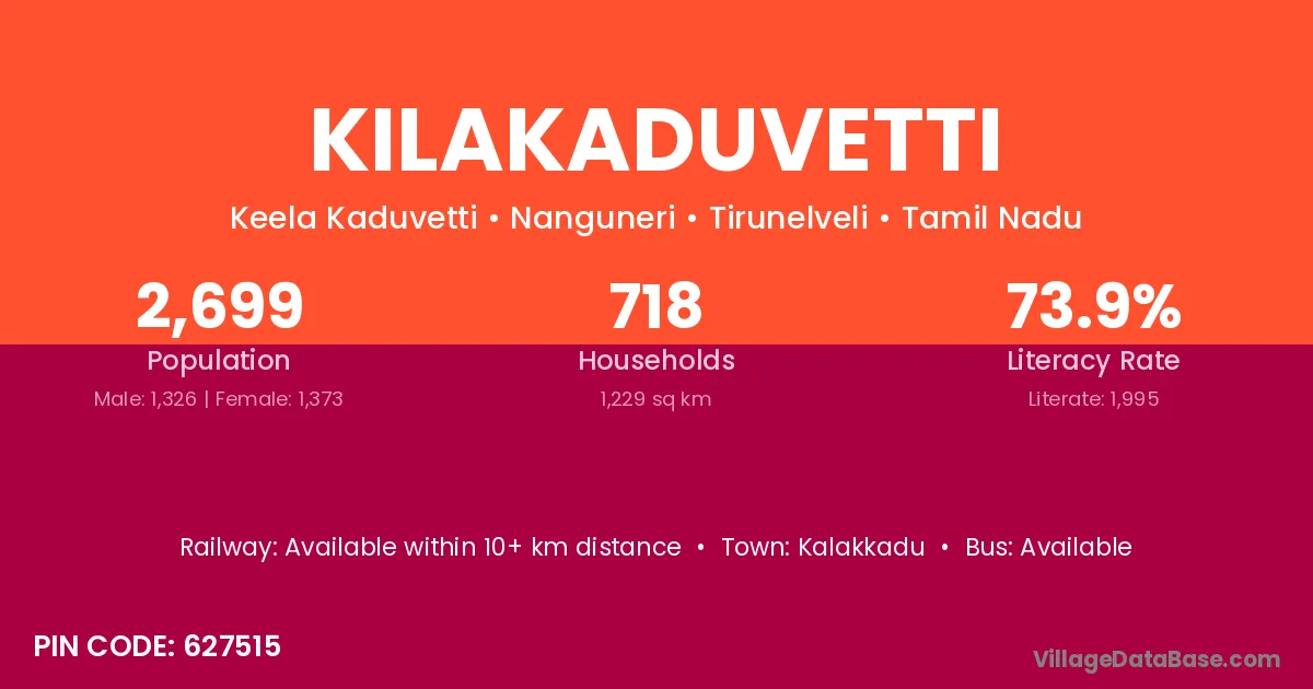 Kalakkadu is the nearest town to Kilakaduvetti village for major economic activities