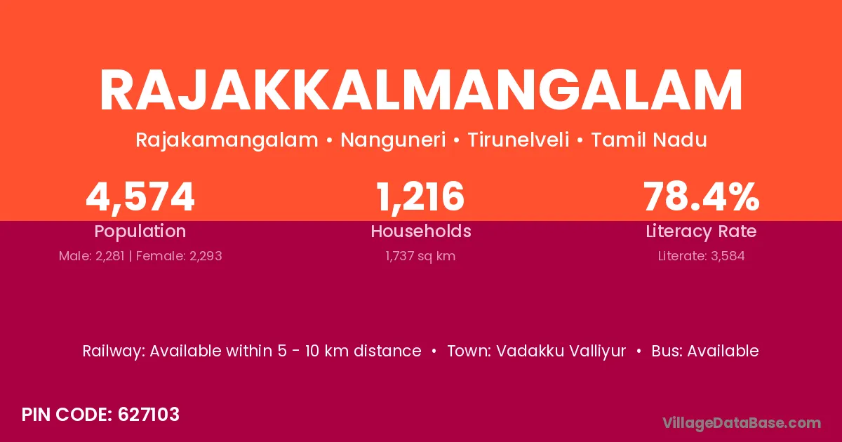 Rajakkalmangalam village has a total population of 4,574 people, of which 2,281 are males and 2,293 are females.