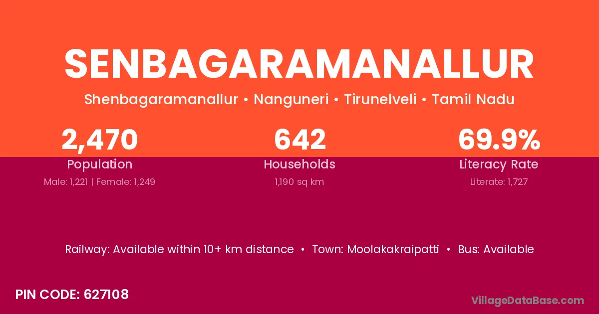 Senbagaramanallur village has a total population of 2,470 people, of which 1,221 are males and 1,249 are females.