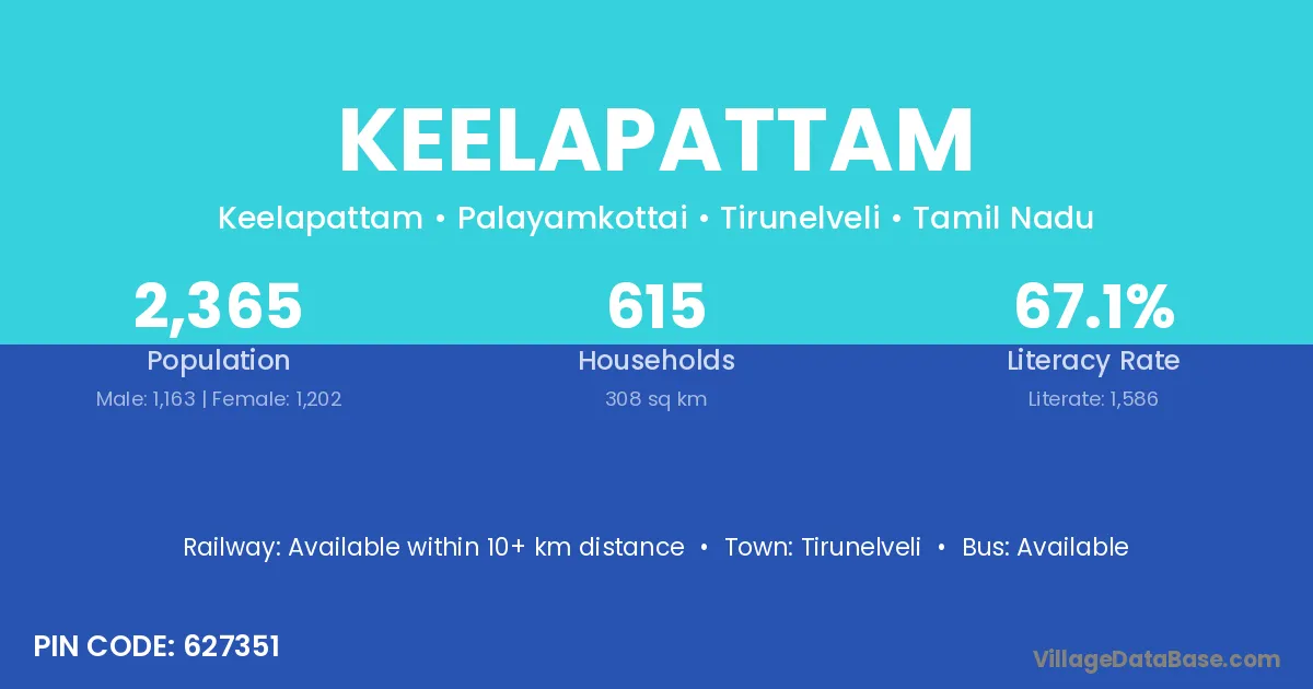 Keelapattam village has a total population of 2,365 people, of which 1,163 are males and 1,202 are females.