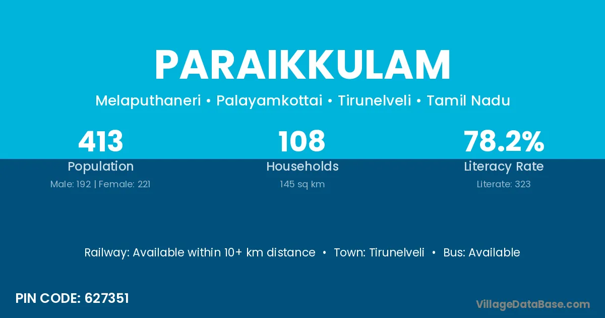 Tirunelveli is the nearest town to Paraikkulam village for major economic activities