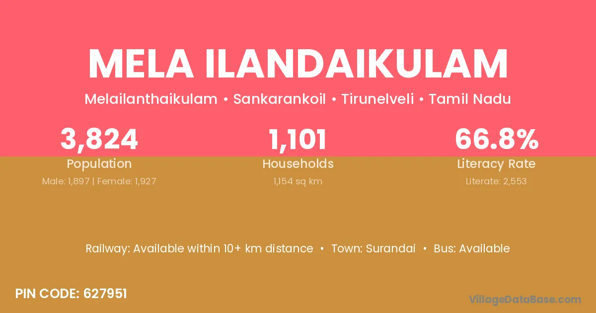 Mela Ilandaikulam village has a total population of 3,824 people, of which 1,897 are males and 1,927 are females.