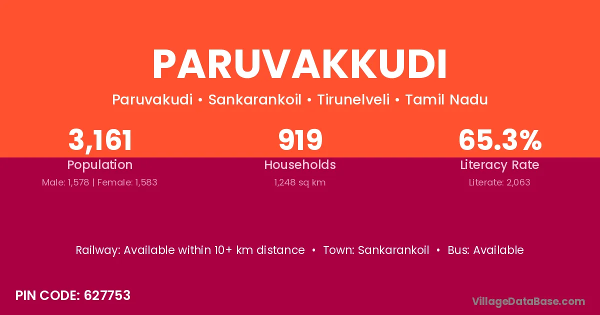 Paruvakkudi village has a total population of 3,161 people, of which 1,578 are males and 1,583 are females.