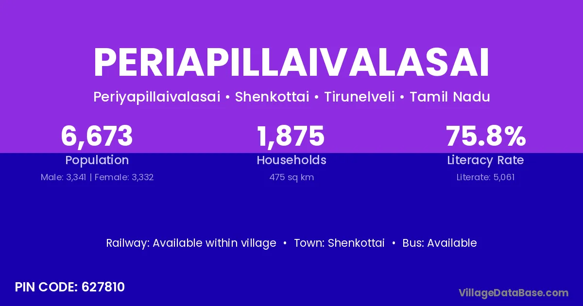 Periapillaivalasai village has a total population of 6,673 people, of which 3,341 are males and 3,332 are females.