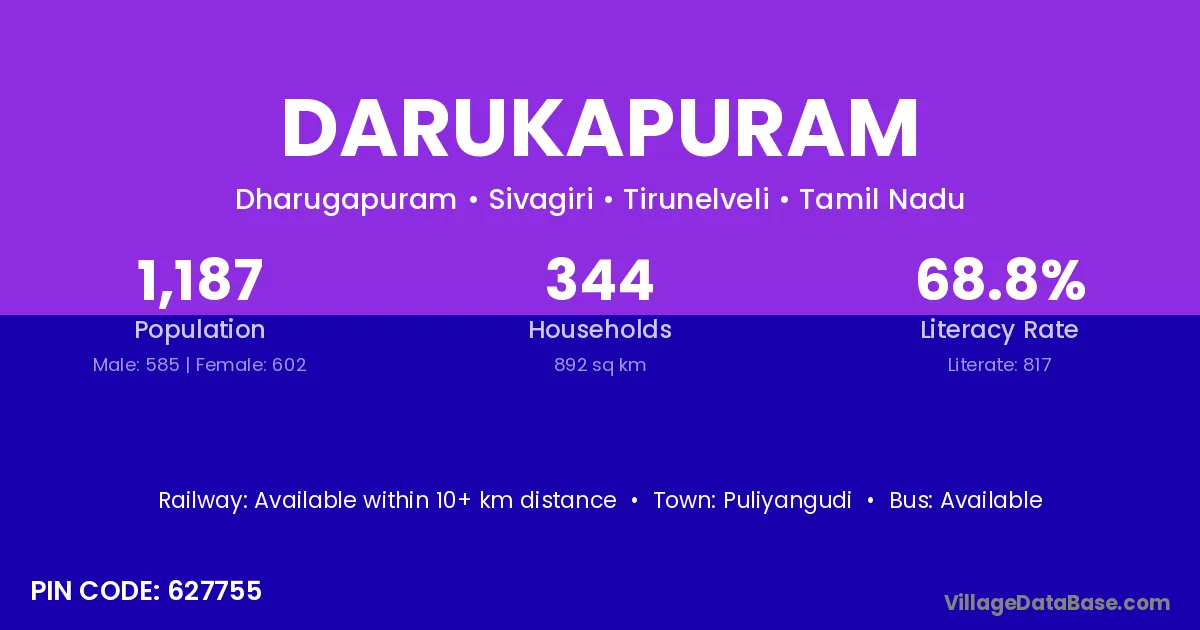 Puliyangudi is the nearest town to Darukapuram village for major economic activities