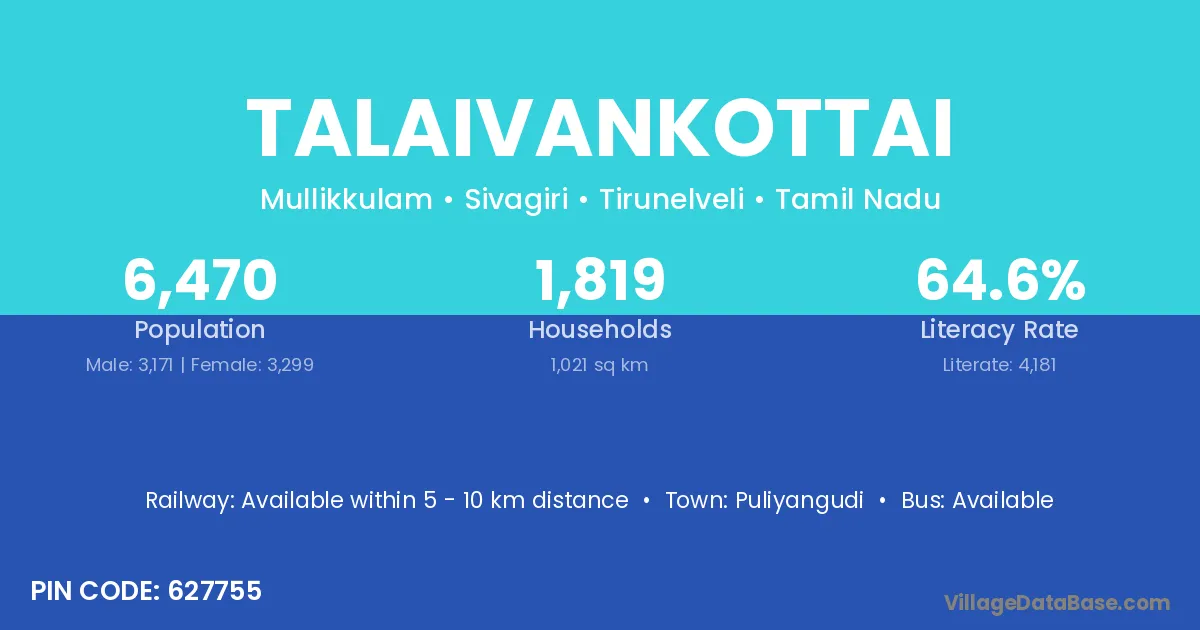 Talaivankottai village has a total population of 6,470 people, of which 3,171 are males and 3,299 are females.