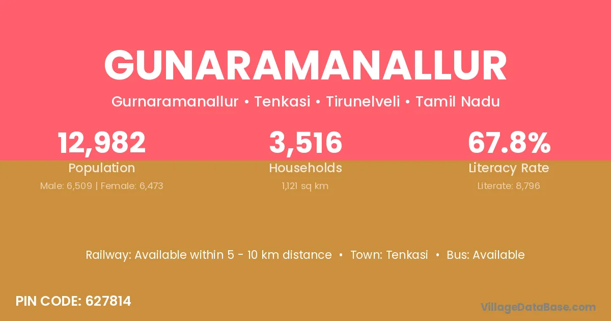 Gunaramanallur village has a total population of 12,982 people, of which 6,509 are males and 6,473 are females.