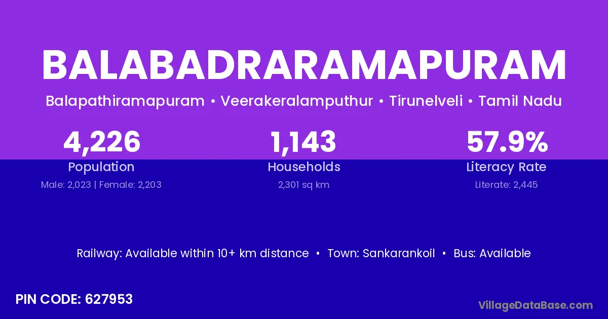 Balabadraramapuram village has a total population of 4,226 people, of which 2,023 are males and 2,203 are females.