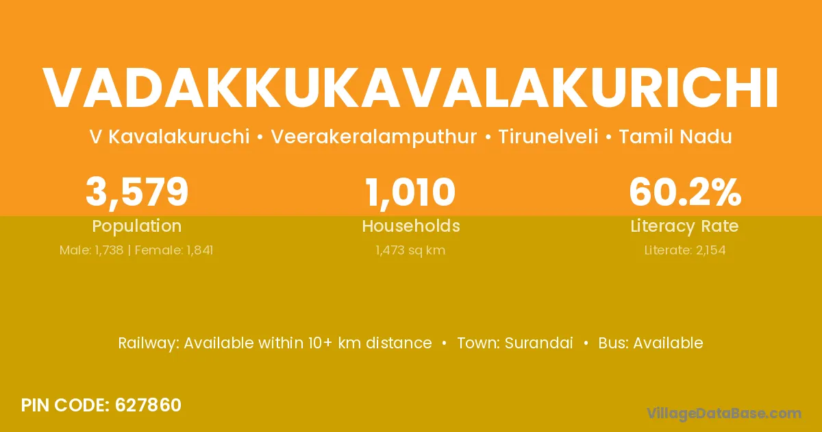 Vadakkukavalakurichi village has a total population of 3,579 people, of which 1,738 are males and 1,841 are females.