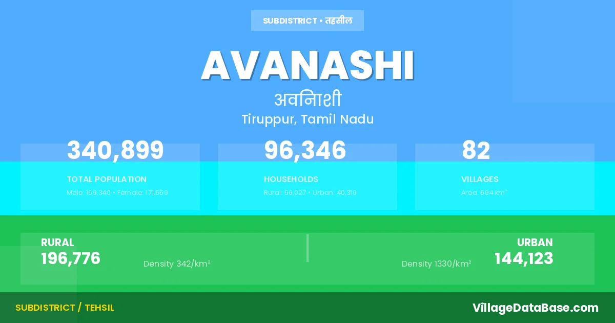 According to the 2011 census The total area of Avanashi Taluka is 684 km², with a population of 340899 people. The population density is 499 inhabitants per square kilometre, and there are approximately 96346 houses in the sub district.