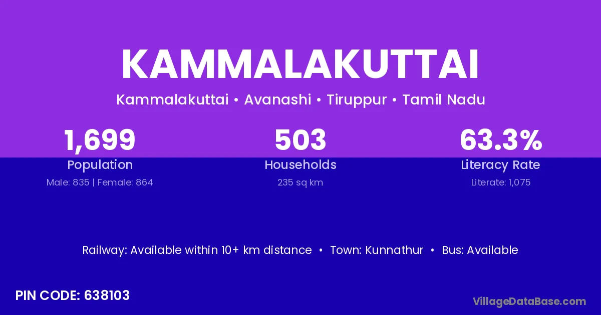 Kammalakuttai village has a total population of 1,699 people, of which 835 are males and 864 are females.