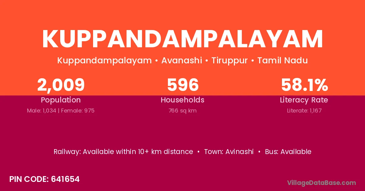 Kuppandampalayam village has a total population of 2,009 people, of which 1,034 are males and 975 are females.