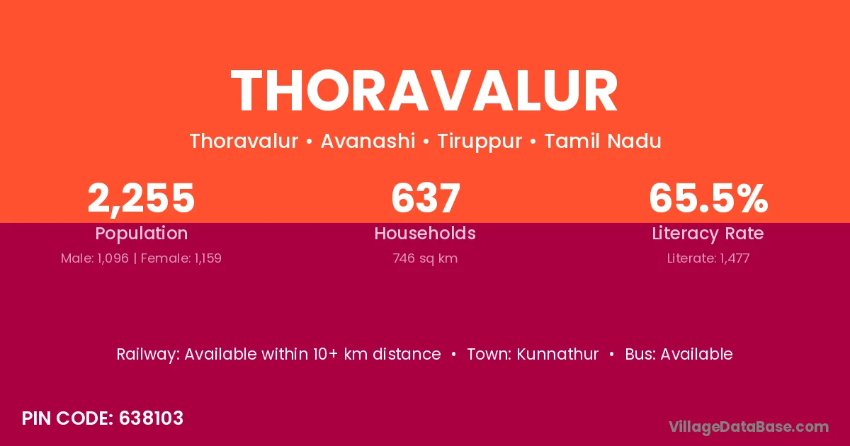 Thoravalur village has a total population of 2,255 people, of which 1,096 are males and 1,159 are females.