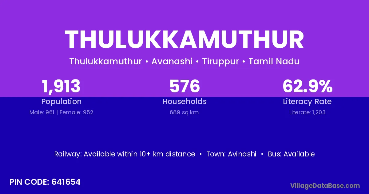 Thulukkamuthur village has a total population of 1,913 people, of which 961 are males and 952 are females.