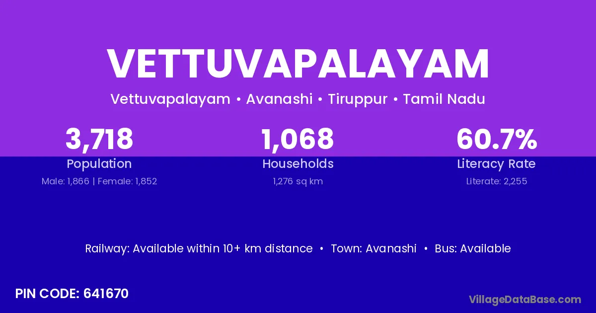 According to Census 2011 information, the village code of Vettuvapalayam village is 641670.