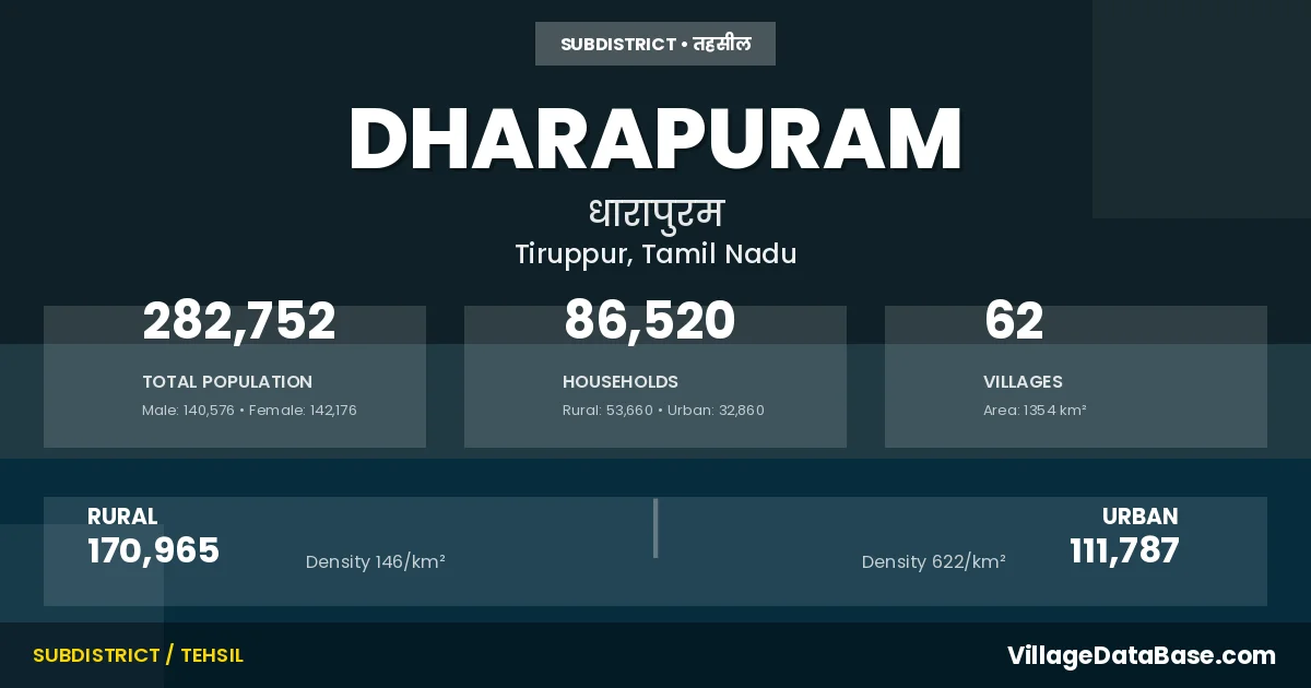 According to the 2011 census The total area of Dharapuram Taluka is 1354 km², with a population of 282752 people. The population density is 209 inhabitants per square kilometre, and there are approximately 86520 houses in the sub district.