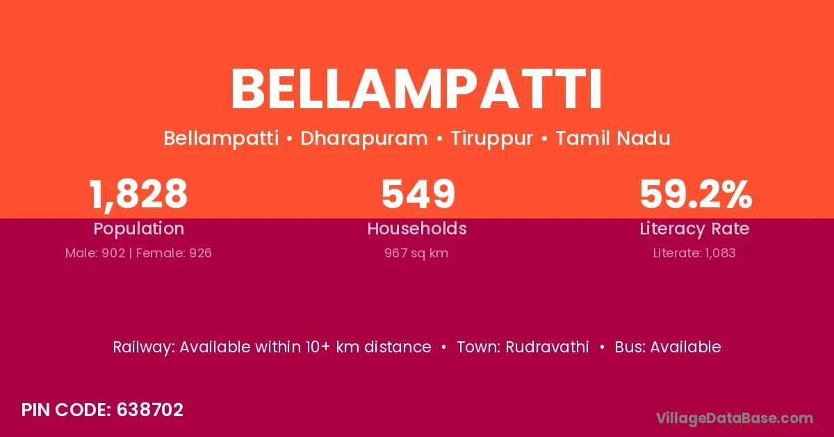 Bellampatti village has a total population of 1,828 people, of which 902 are males and 926 are females.