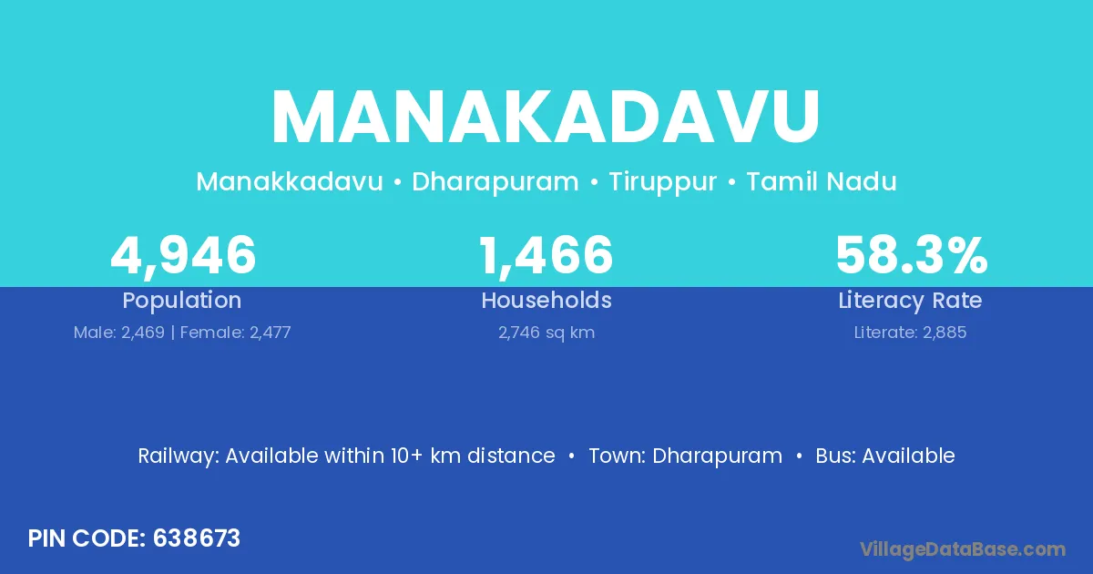 Dharapuram is the nearest town to Manakadavu village for major economic activities