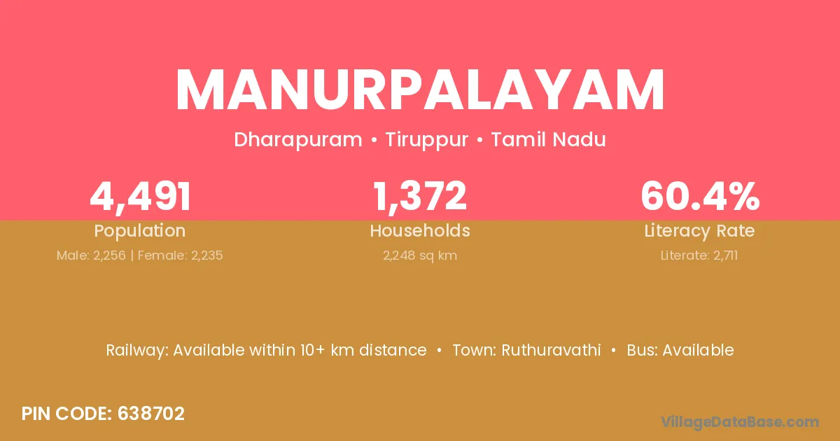Manurpalayam village has a total population of 4,491 people, of which 2,256 are males and 2,235 are females.