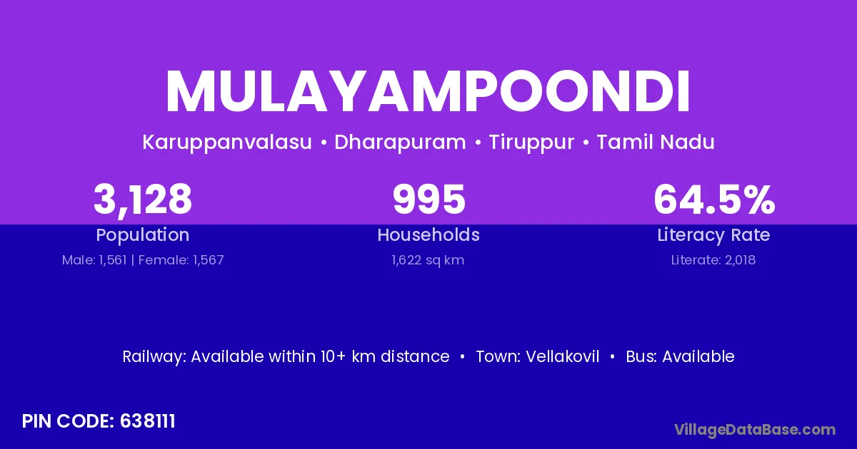 Mulayampoondi village has a total population of 3,128 people, of which 1,561 are males and 1,567 are females.