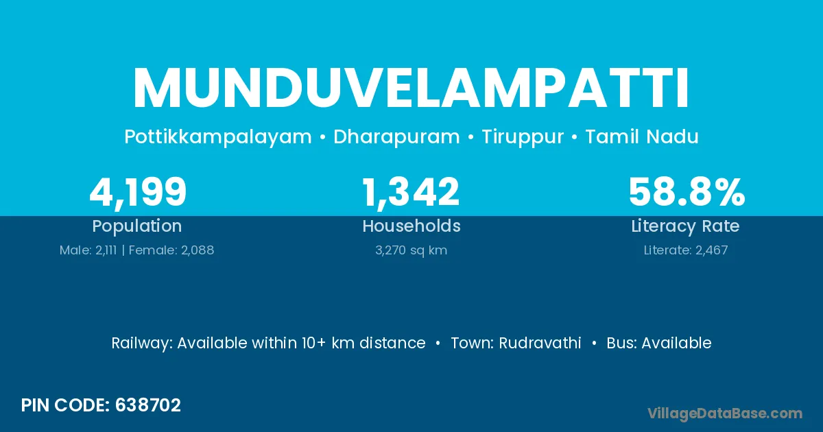 Munduvelampatti village has a total population of 4,199 people, of which 2,111 are males and 2,088 are females.