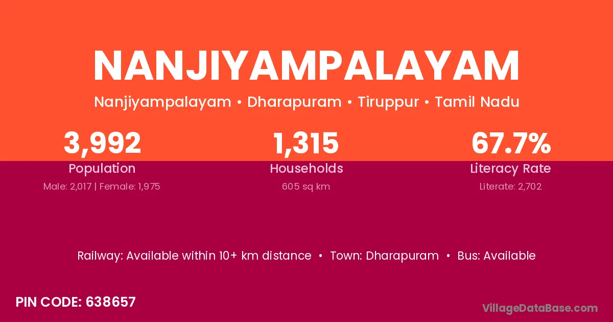 Nanjiyampalayam village has a total population of 3,992 people, of which 2,017 are males and 1,975 are females.