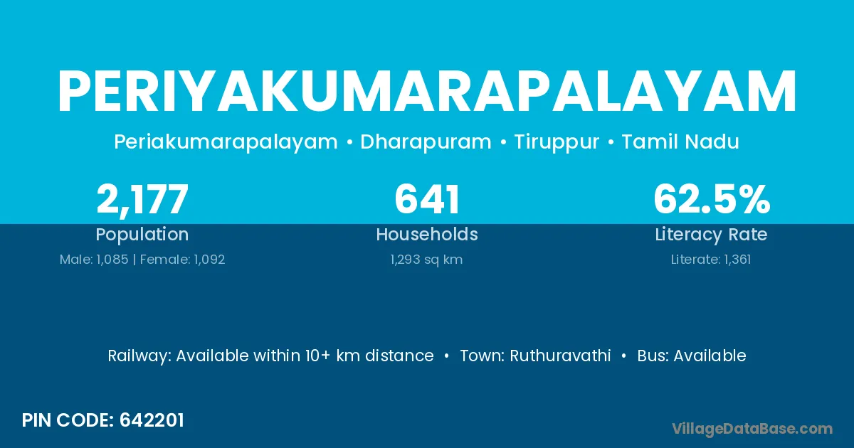 Periyakumarapalayam village has a total population of 2,177 people, of which 1,085 are males and 1,092 are females.