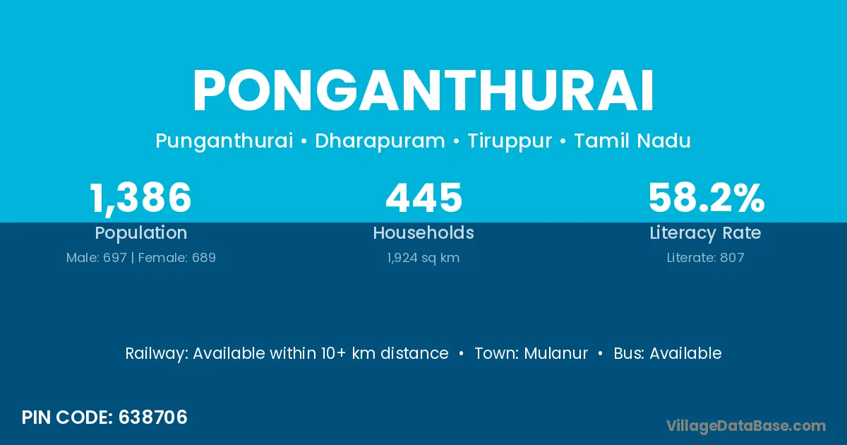Ponganthurai village has a total population of 1,386 people, of which 697 are males and 689 are females.