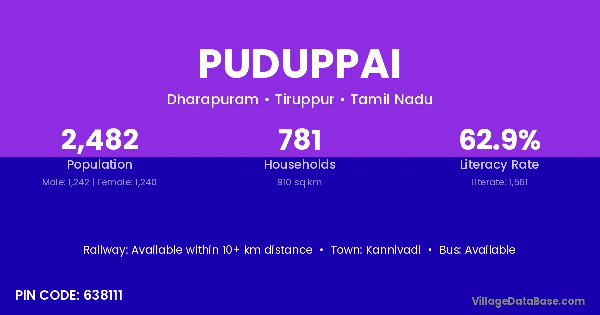 Puduppai village has a total population of 2,482 people, of which 1,242 are males and 1,240 are females.