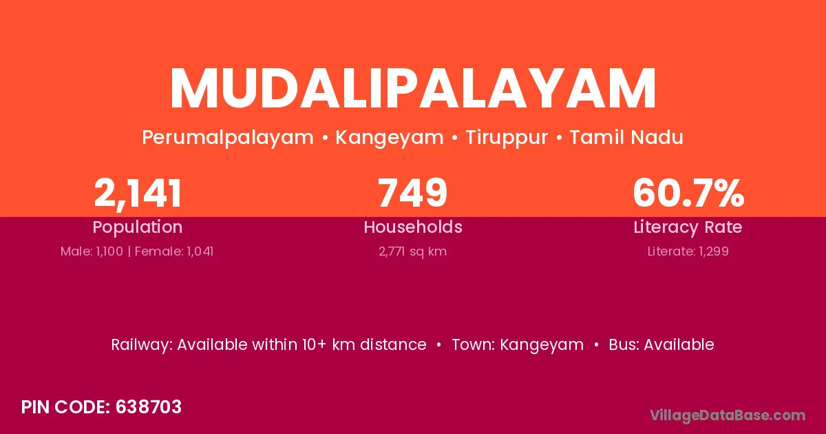 Mudalipalayam village has a total population of 2,141 people, of which 1,100 are males and 1,041 are females.