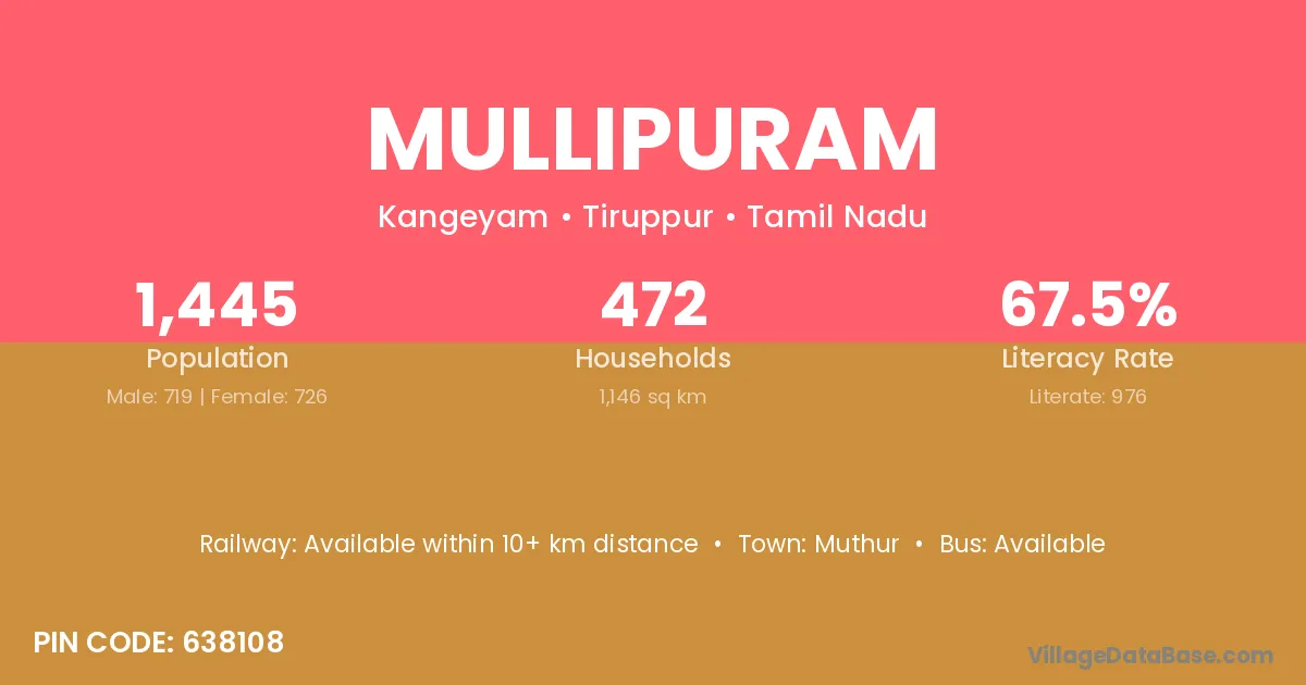 Mullipuram village has a total population of 1,445 people, of which 719 are males and 726 are females.