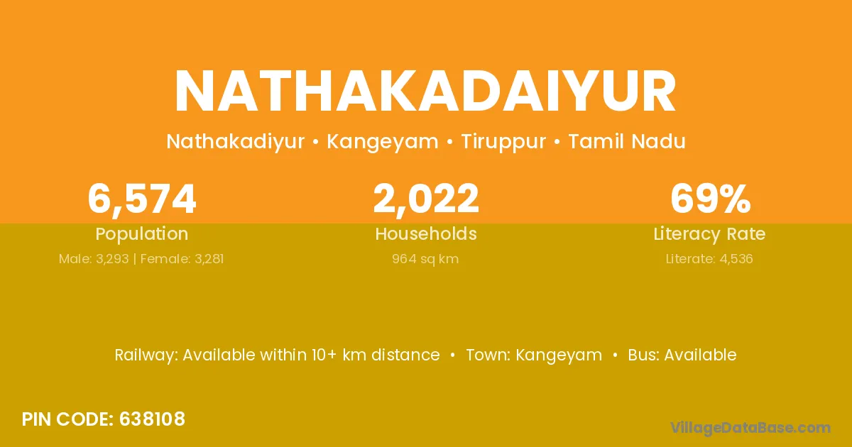 Kangeyam is the nearest town to Nathakadaiyur village for major economic activities