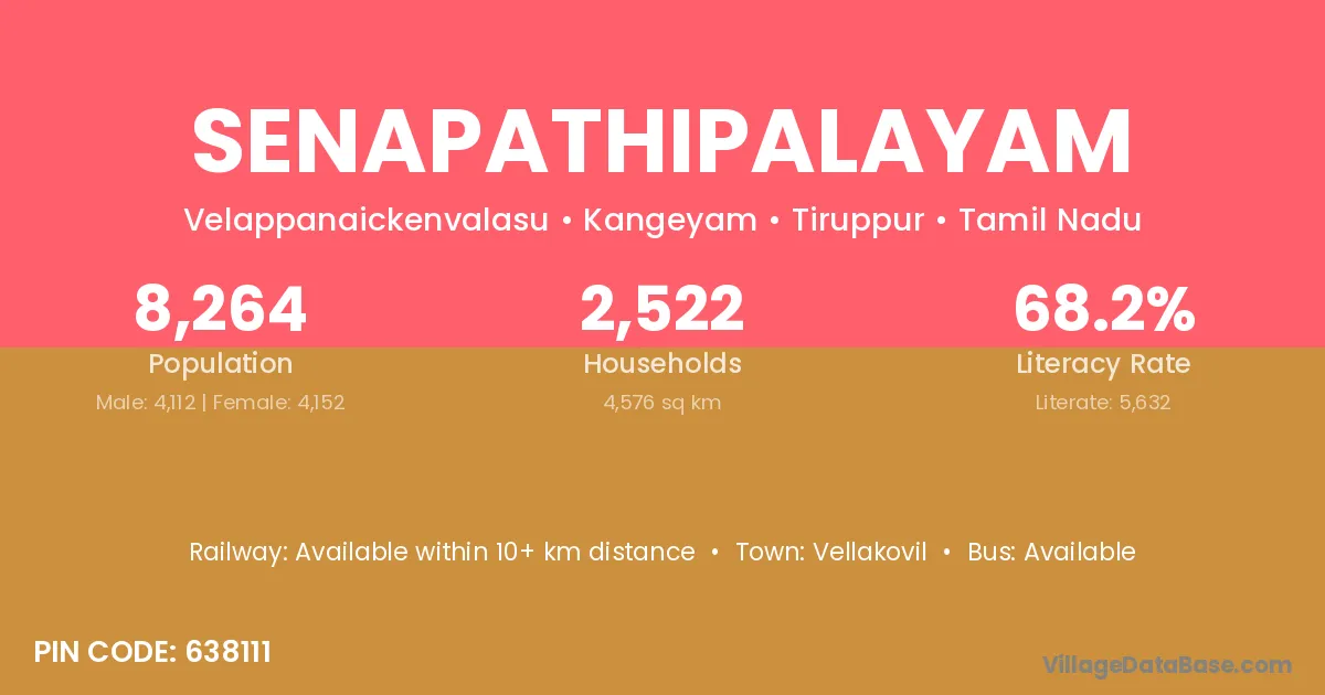 Senapathipalayam village has a total population of 8,264 people, of which 4,112 are males and 4,152 are females.