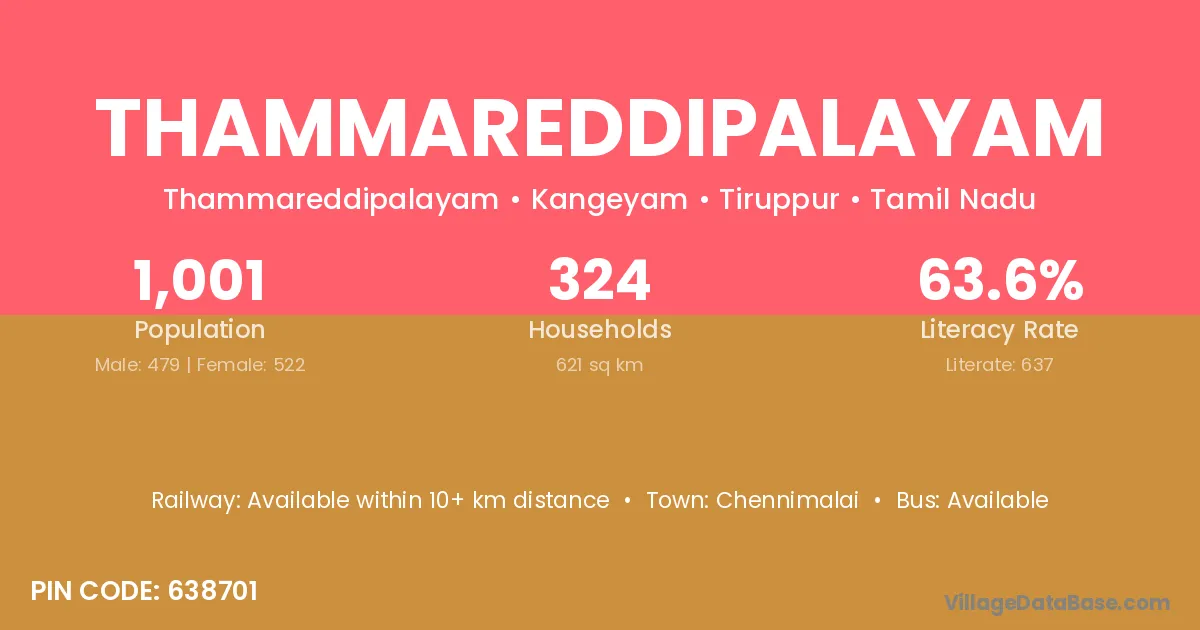 Thammareddipalayam village has a total population of 1,001 people, of which 479 are males and 522 are females.