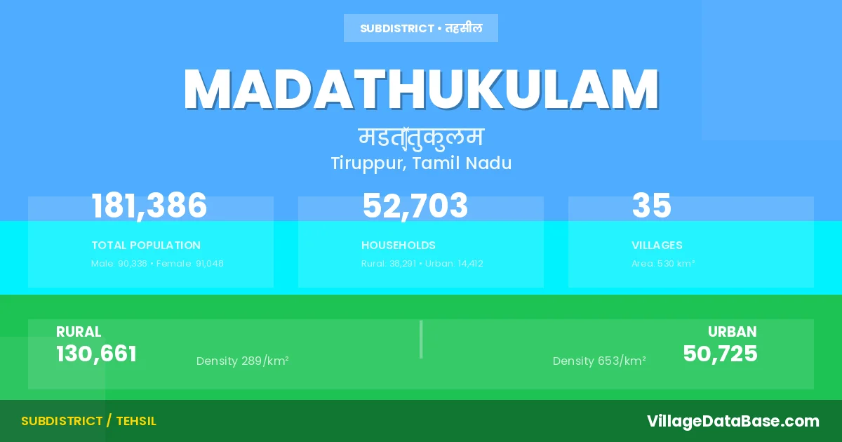 According to the 2011 census The total area of Madathukulam Taluka is 530 km², with a population of 181386 people. The population density is 342 inhabitants per square kilometre, and there are approximately 52703 houses in the sub district.