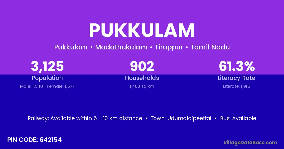 Pukkulam village has a total population of 3,125 people, of which 1,548 are males and 1,577 are females.