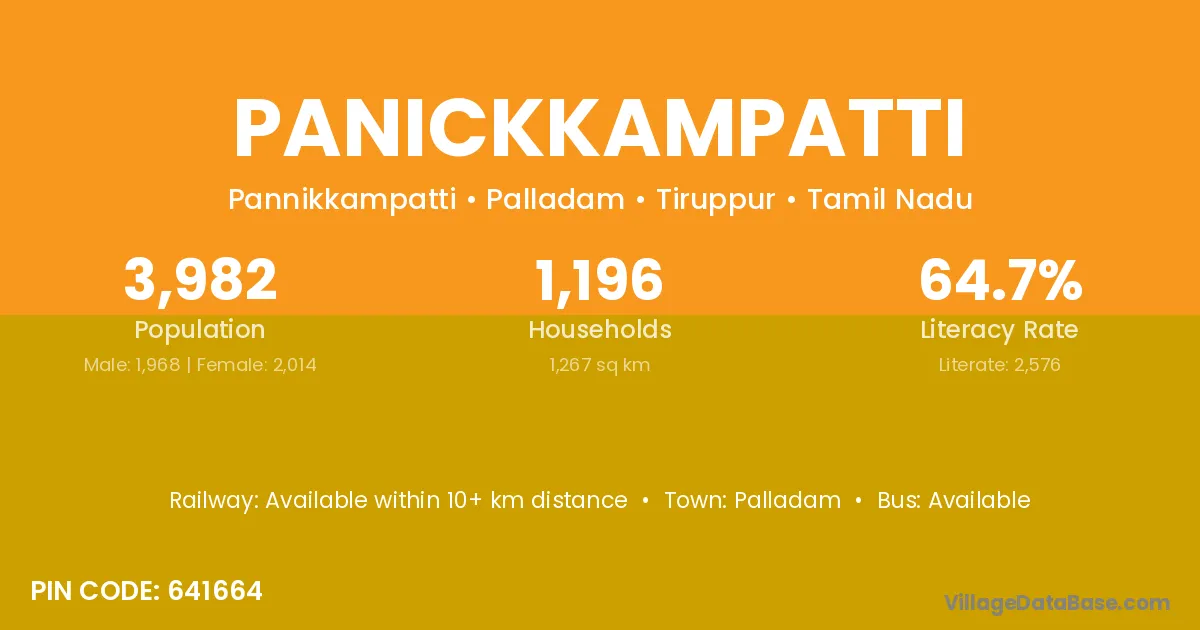 Panickkampatti village has a total population of 3,982 people, of which 1,968 are males and 2,014 are females.