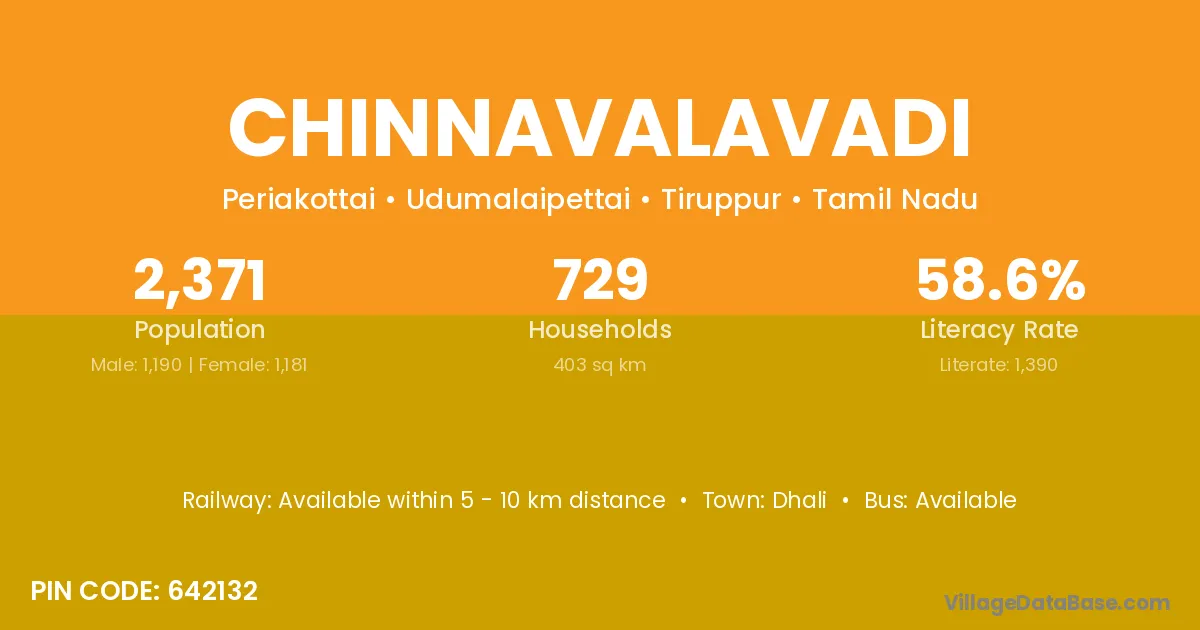 Chinnavalavadi village has a total population of 2,371 people, of which 1,190 are males and 1,181 are females.