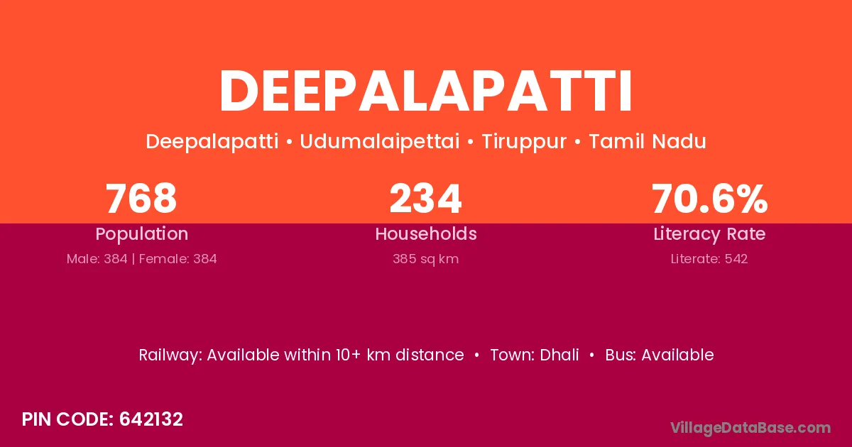 Deepalapatti village has a total population of 768 people, of which 384 are males and 384 are females.