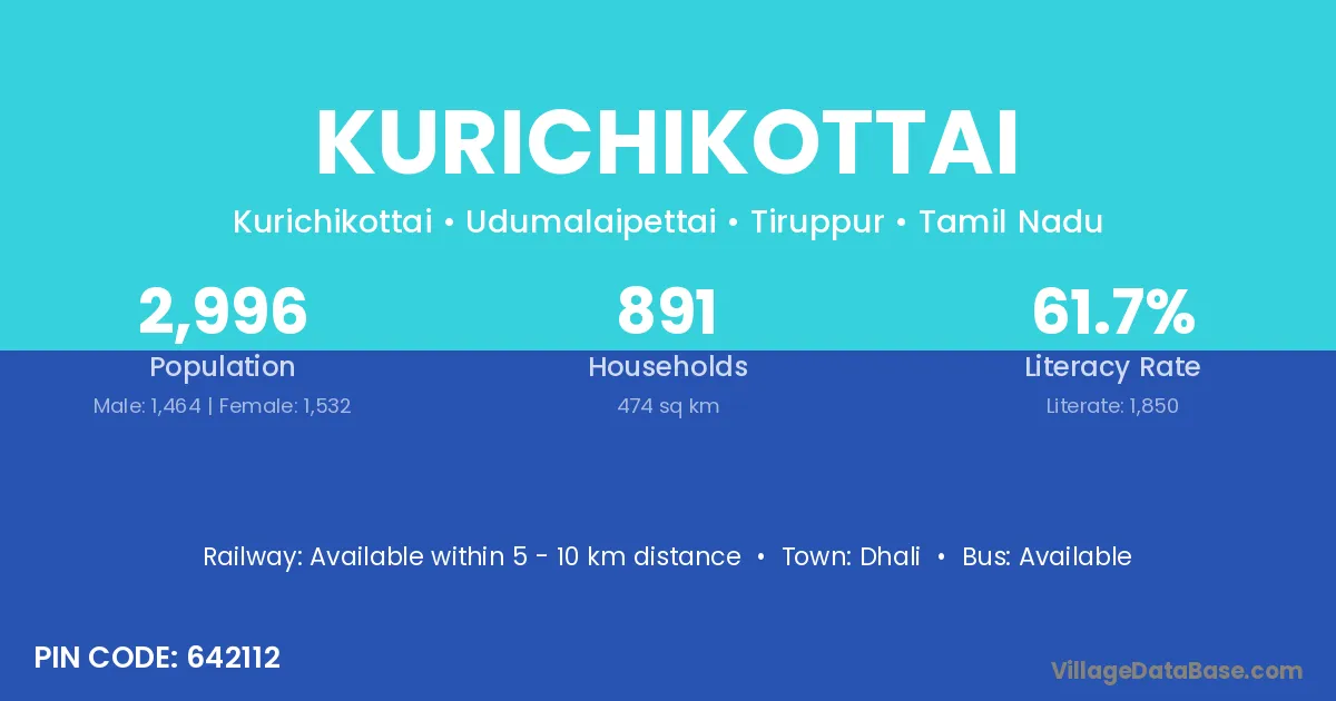 Kurichikottai village has a total population of 2,996 people, of which 1,464 are males and 1,532 are females.