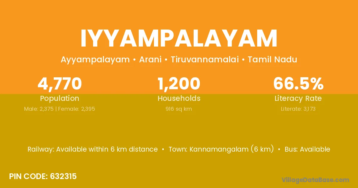 Kannamangalam (6 km) is the nearest town to Iyyampalayam village for major economic activities and is located approximately 6 km away.