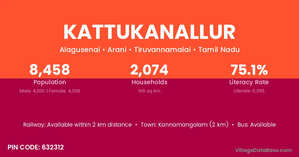 Kattukanallur village has a total population of 8,458 people, of which 4,200 are males and 4,258 are females.