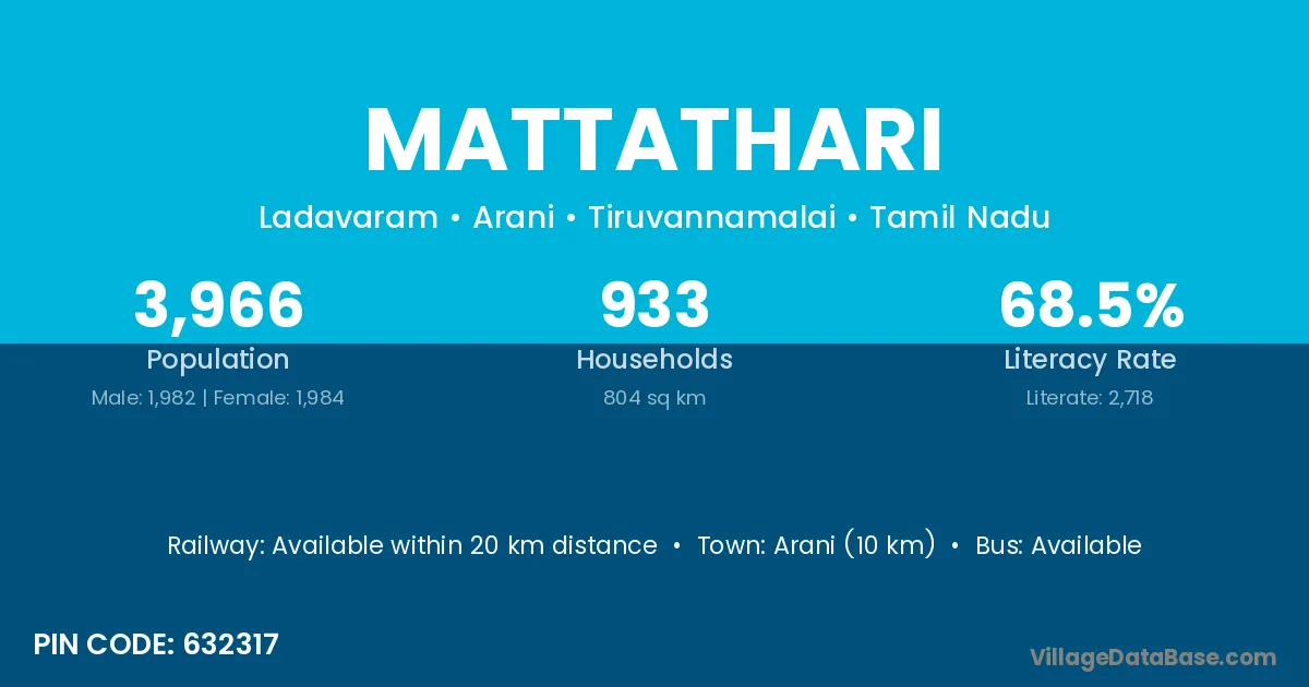 Arani (10 km) is the nearest town to Mattathari village for major economic activities and is located approximately 10 km away.
