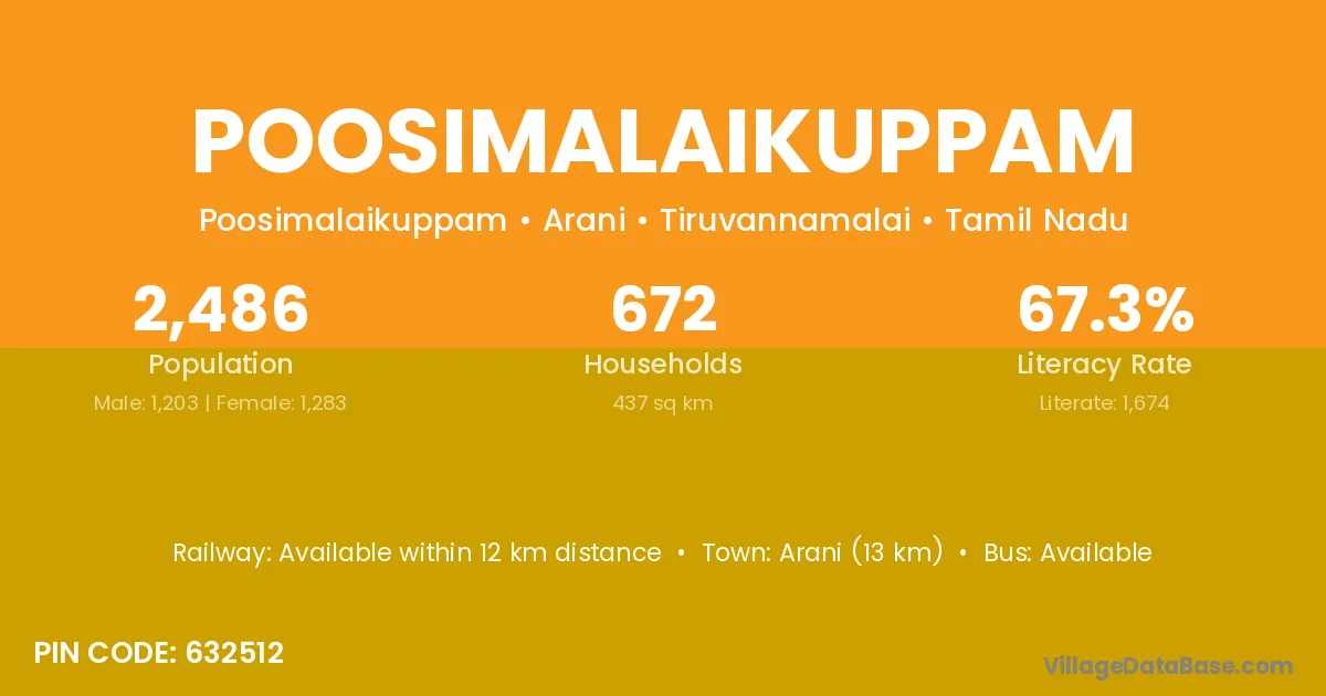 Arani (13 km) is the nearest town to Poosimalaikuppam village for major economic activities and is located approximately 13 km away.