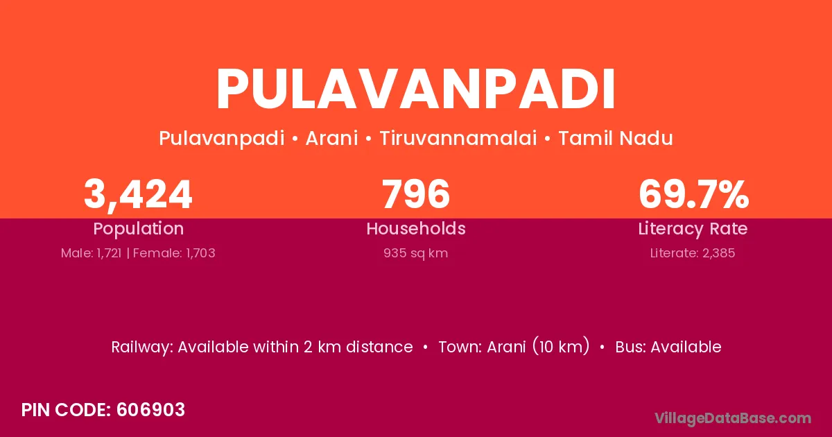 Arani (10 km) is the nearest town to Pulavanpadi village for major economic activities and is located approximately 10 km away.